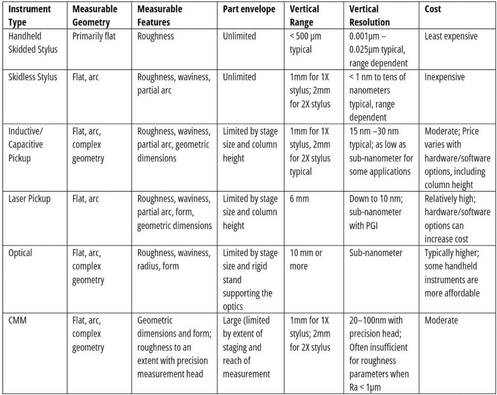 - Geometry: whether the instrument is capable of measuring roughness, waviness, and/or form/contour/roundness